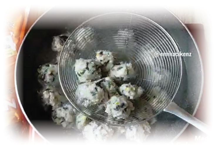 Rebus air secukupnya ke dalam panci, kemudian bentuk bulat bulat adonan dengan sendok lalu cemplung kan ke air mendidih