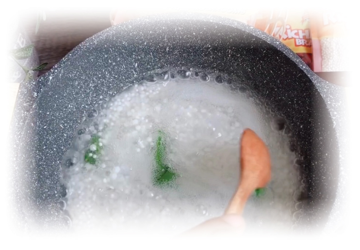 Rebus air putih, daun pandan, kayu manis dan gula, lalu rebus hingga adonan larut
