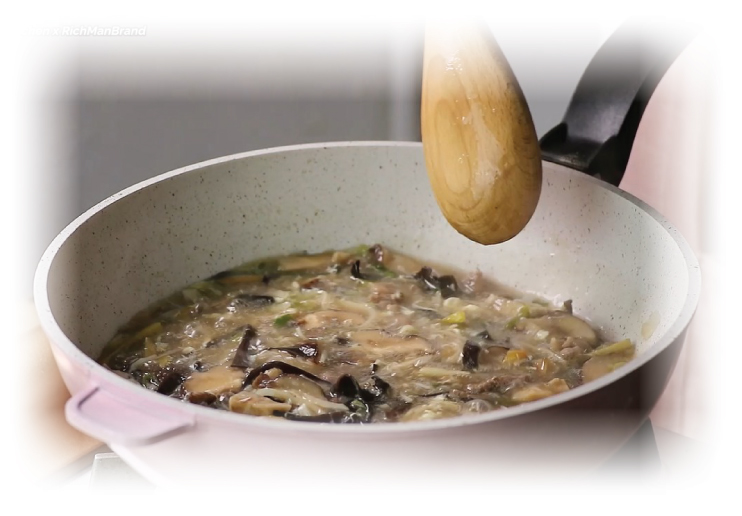 Masukan daging sapi, jamur fragrant, jamur wood ear, wortel, rebung, tepung tapioka yang sudah ditambahkan air, dan kocokan telur. Setelah itu aduk hingga merata