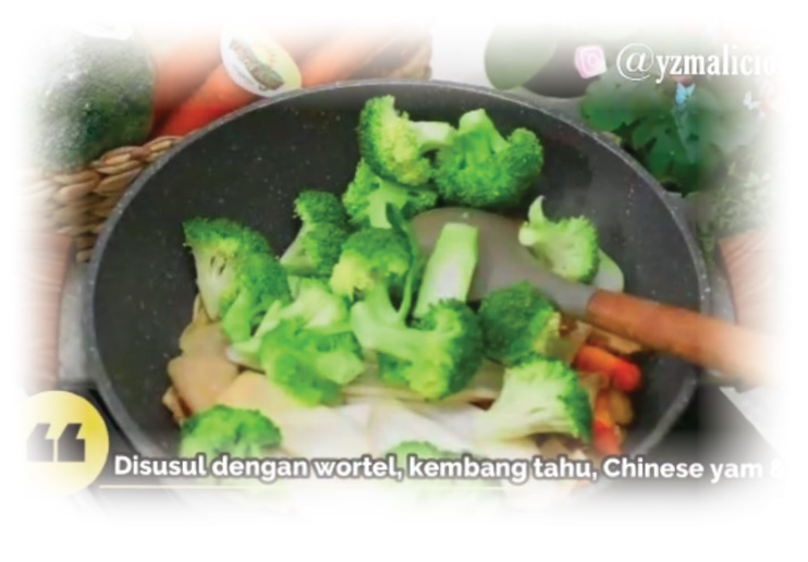 - Oseng bumbu parut, masukkan jamur shitake dan aduk sebentar. Disusul wortel, brokoli dan kembang tahu.